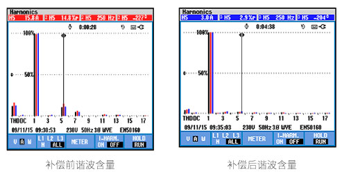 補(bǔ)償前5次諧波電流15.8A畸變率14.8% ,補(bǔ)償后5次諧波電流3A畸變率2.9%)