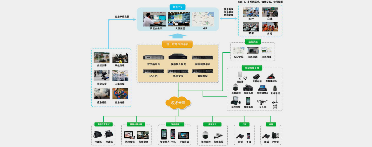 目前,公共安全事件及群體性事件時(shí)有發(fā)生,應(yīng)對城市突發(fā)公共事件已成為政府部門一項(xiàng)非常具有挑戰(zhàn)性的工作。如何高效利用有限的資源,提高政府部門對緊急事件快速反應(yīng)和抵御風(fēng)險(xiǎn)的能力,并為人民群眾提供更快捷的緊急救助服務(wù),成為政府職能部門的主要工作內(nèi)容之一。政府綜合應(yīng)急指揮調(diào)度系統(tǒng)旨在幫助政府相關(guān)工作部門輕松完成大范圍、不同人員統(tǒng)一通信指揮,實(shí)現(xiàn)全員協(xié)同通信、實(shí)時(shí)可視指揮、資源GIS管控調(diào)度和圖形化任務(wù)交互,具備同時(shí)處理多起突發(fā)事件的能力,提高對應(yīng)急事件的能力和應(yīng)急處置效率。